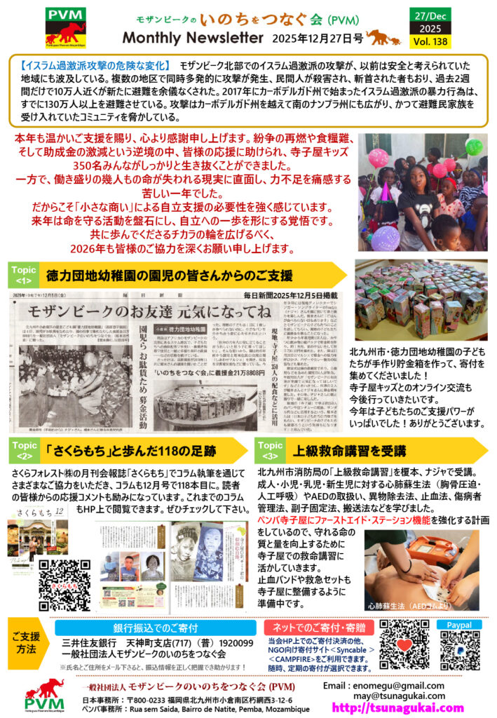 本年、私たちはあまりに多くの惜別を経験しました。 特に、家族と地域を支える柱である20代から40代の青年男子の死者が例年を大きく上回り、紛争と疾病が人々の日常を容赦なく奪っています。 「明日をどう生きるか」を語る前に、「今この瞬間をいかに繋ぐか」。私たちは日々、その過酷な問いと向き合い行動を続けてきました。