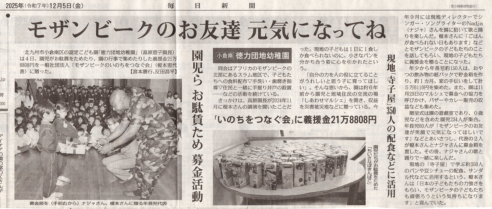 北九州市小倉南区の認定こども園「徳力団地幼稚園」(高原恵子園長)は4日、園児がお駄賃をためたり、園の行事で集めたりした義援金21万8808円を一般社団法人「モザンビークのいのちをつなぐ会」(榎本恵代表)に贈った。