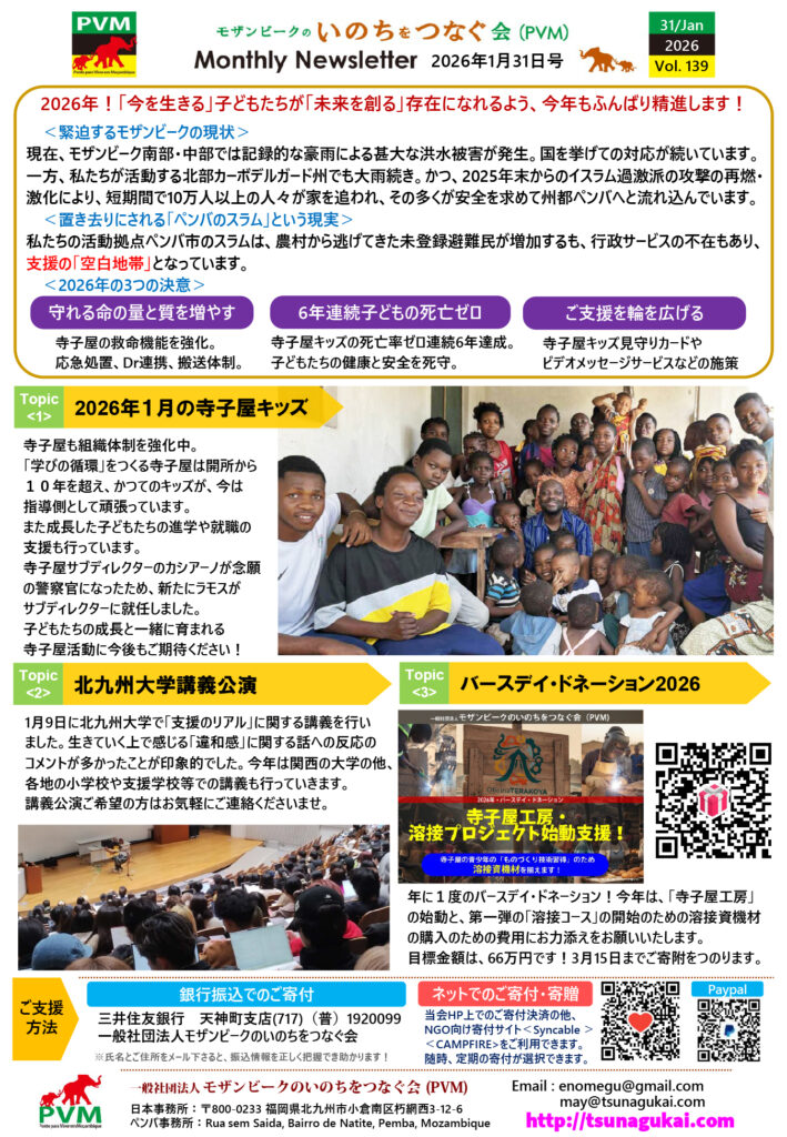 2026年、新しい年が幕を開けました。 モザンビークでは記録的な豪雨による洪水被害や、北部での紛争再燃といった厳しいニュースが続いています 。私たちが活動するペンバ市スラムにも、安全を求めて10万人以上の人々が流れ込み、支援の「空白地帯」が広がっているのが現状です 。