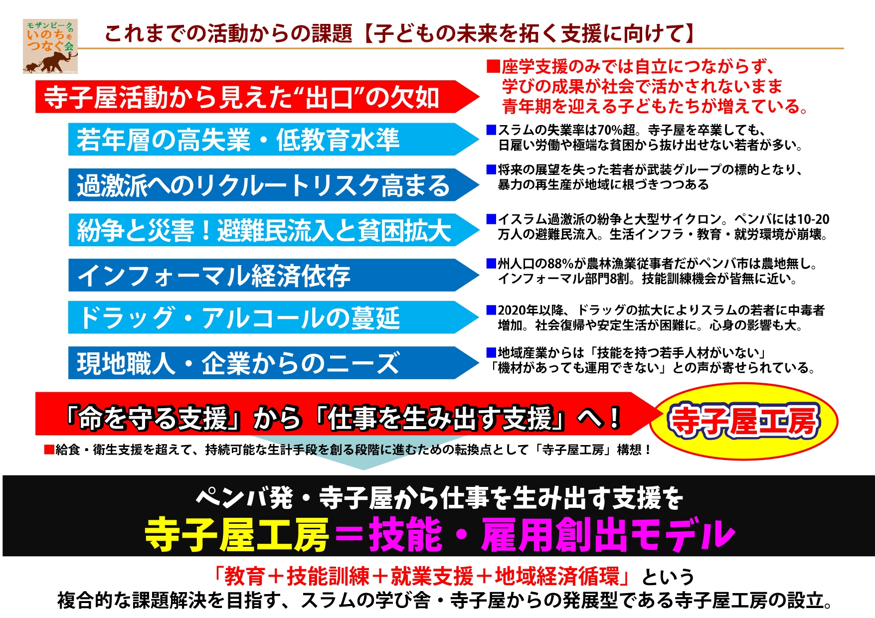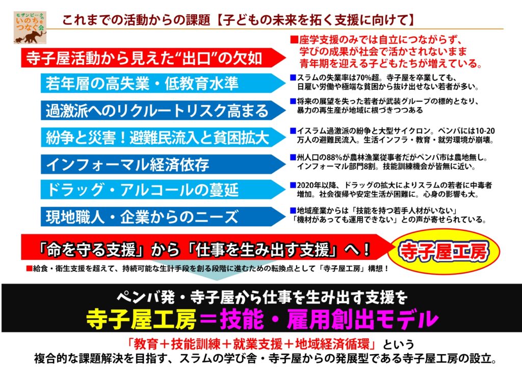 350名以上の子どもたちが通うペンバ寺子屋での「命を守る支援」をしっかり実施しながら、新たに「仕事を生み出す支援」に挑戦!!
